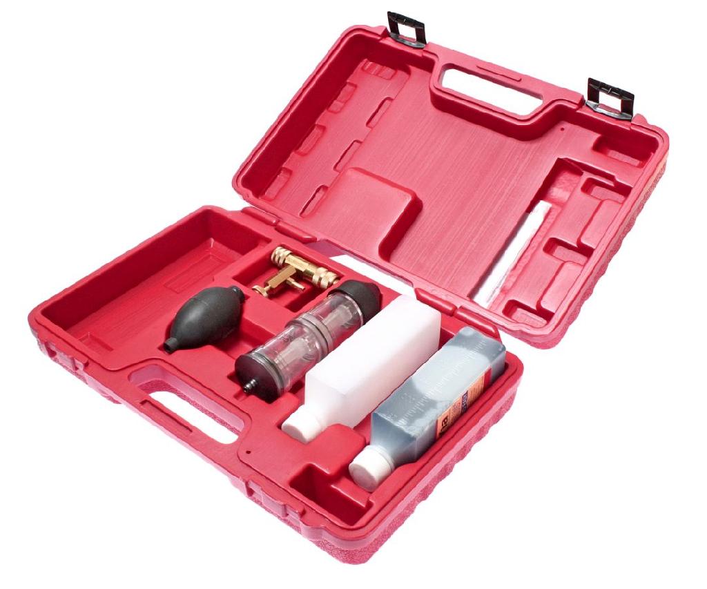 Набор представляет собой диагностическое устройство – тестер, с помощью которого можно определить содержания выхлопных газов в охлаждающей жидкости системы охлаждения двигателя автомобиля. Наличие выхлопных газов косвенно свидетельствует о проблемах, связанных с микротрещинами в камере сгорания, или неплотной прилегающей прокладке между блоком двигателя и ГБЦ и т.п., обычно возникающих после перегрева двигателя.
