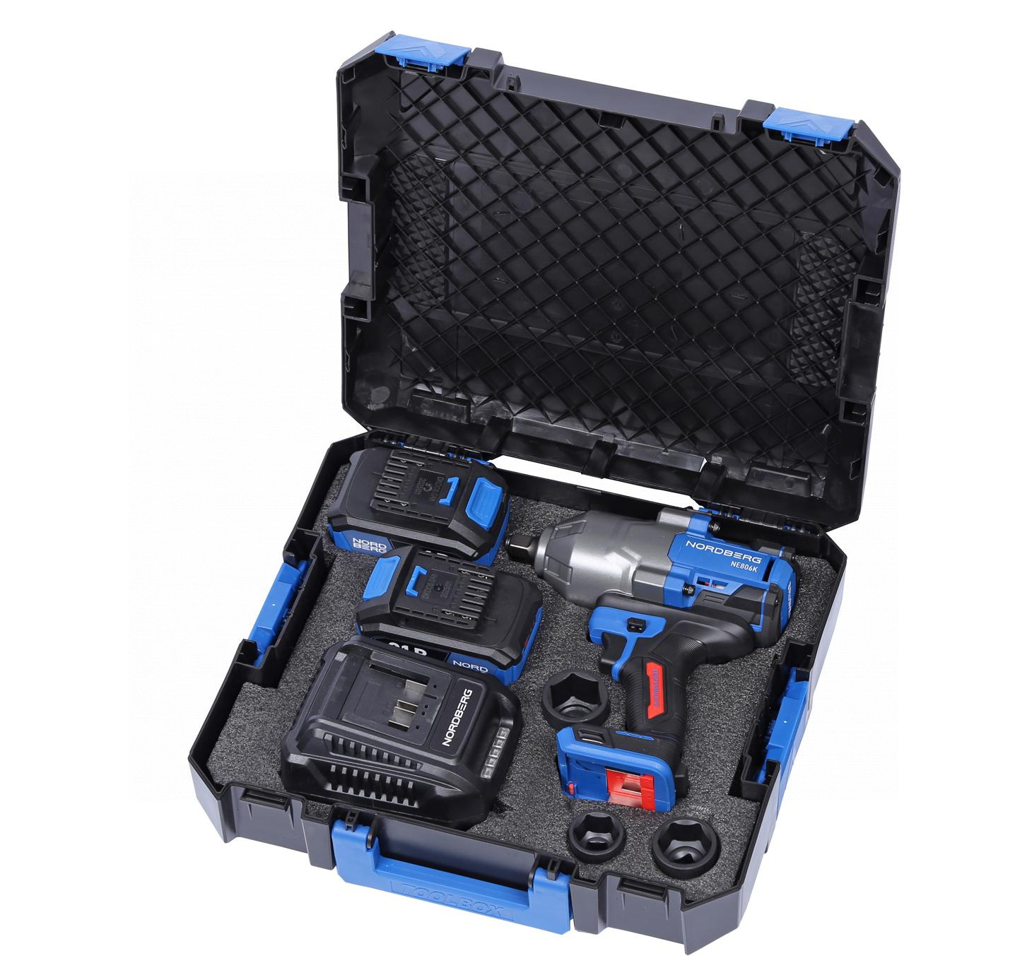 Гайковерт аккумуляторный Nordberg NE806K-1/2, 1/2", 21В, 1500Нм с двумя 6A аккум. и зар. у-вом, в ке
