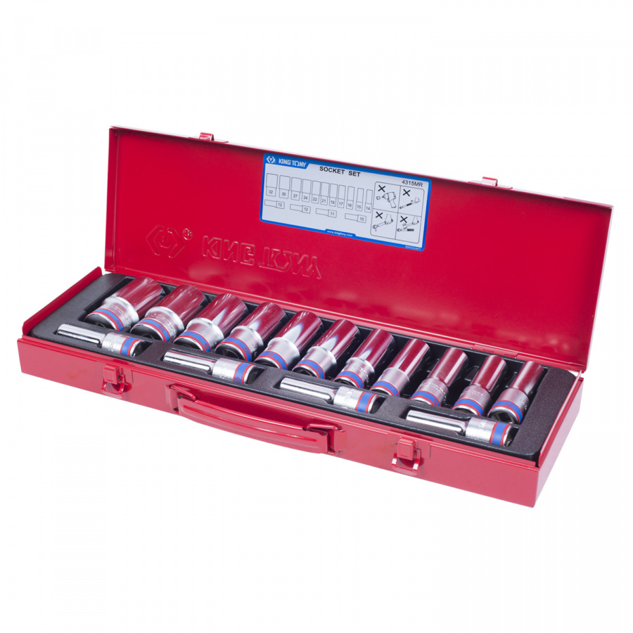 - Набор глубоких торцевых головок 1/2", шестигранные, 10-32 мм, 15 предметов KING TONY 4315MR