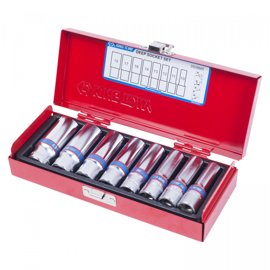 - Набор глубоких торцевых головок 3/8", шестигранные, 10-19 мм, 8 предметов KING TONY 3508MR