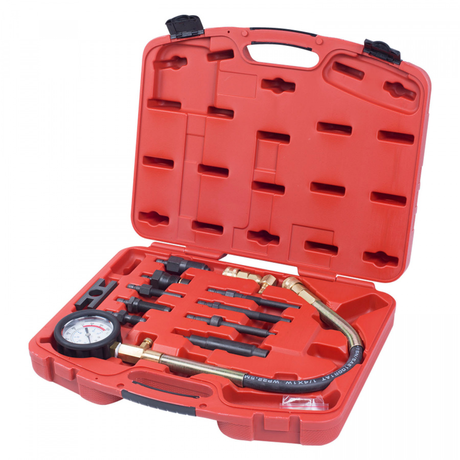 355 мм Шкала 0-70 атм Угловой адаптер 1 шт Адаптеры для свечей накаливания 5 шт Адаптеры под инжекторы 4 шт Адаптер прижимной 1 шт Ремонтный комплект 1 шт Пластиковый кейс -