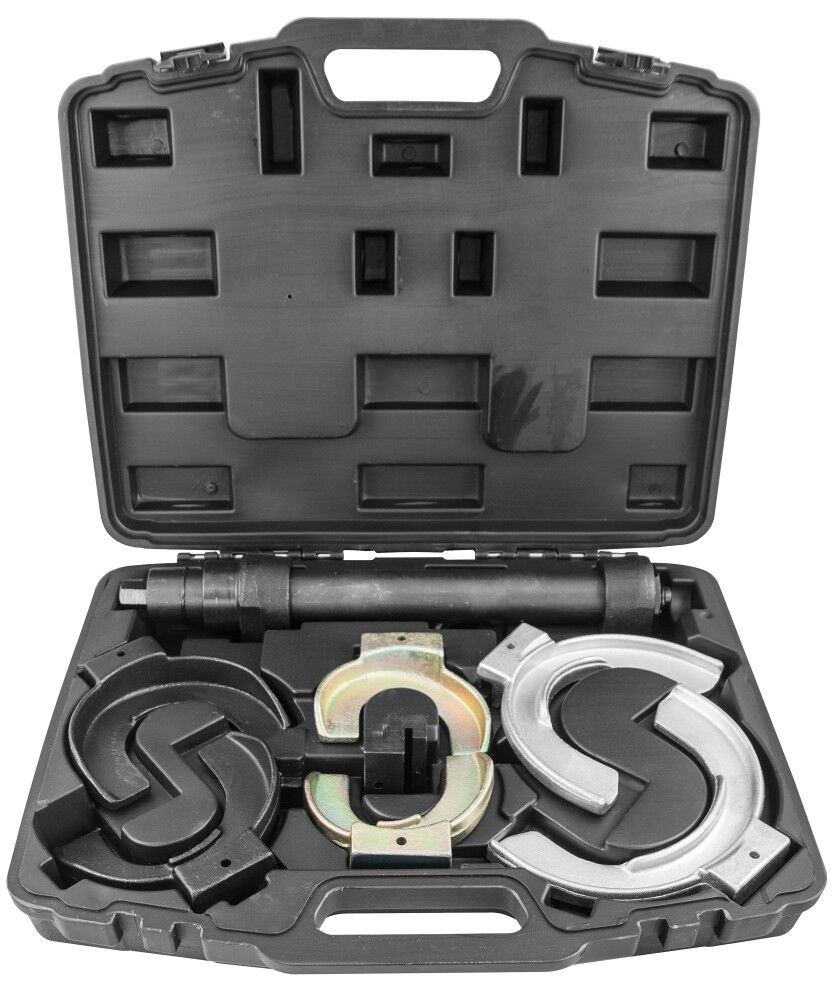ОписаниеМНОГОФУНКЦИОНАЛЬНЫЙ ИНСТРУМЕНТ, РАЗРАБОТАННЫЙ ДЛЯ СОВРЕМЕННЫХ ПОДВЕСОК ТИПА «MacPherson». ИСПОЛЬЗУЮТСЯ 6 СМЕННЫХ НАСАДОК ПОПАРНО ПРИ ПРОИЗВОДСТВЕ РАБОТ С ЦИЛИНДРИЧЕСКИМИ ВИТЫМИ ПРУЖИНАМИ ИЛИ ВАРИАТИВНО - ПРИ ОБСЛУЖИВАНИИ ЭЛЕМЕНТОВ ПОДВЕСКИ, СНАБЖЕННЫХ КОНИЧЕСКИМИ ВИТЫМИ ПРУЖИНАМИ.