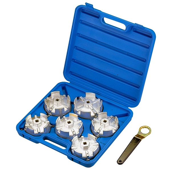 Набор съёмников масляных фильтров, 7 предметов МАСТАК 103-40007С предназначен для снятия или установки масляных фильтров двигателей большегрузных автомобилей. Материал: алюминий. -