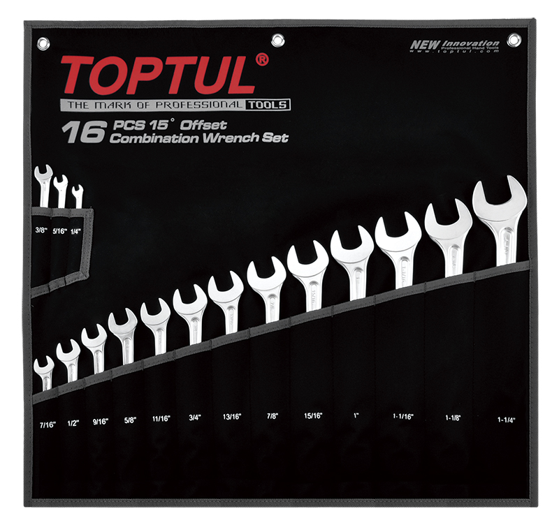 - Набор TOPTUL ключей комбинированных дюймовых 1/4"-1-1/4", 16 предметов на полотне