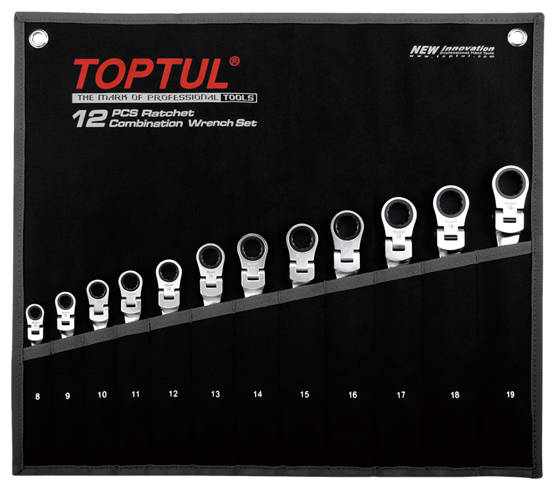 - Набор TOPTUL ключей комбинированных трещоточных шарнирных 8-19 мм, 12 предметов на полотне