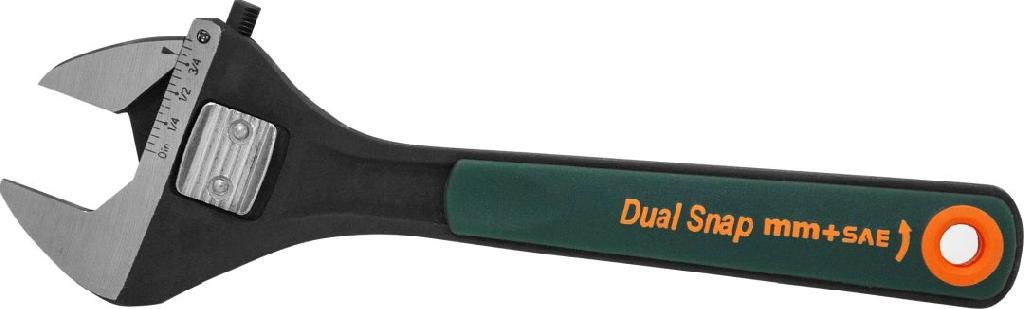 ОписаниеРазводной гаечный ключ с механизмом регулировки размера зева, снабженным специальным устройством, обеспечивающим точную фиксацию губок инструмента на крепеже в независимости от размера метрического или дюймо-вого, практически исключающим присущие обычным разводным ключам люфты. Дополнительно регулировка размера занимает в пять раз меньше времени по сравнению с обычными разводны-ми ключами. Ключ снабжен двусторонней размерной шкалой.