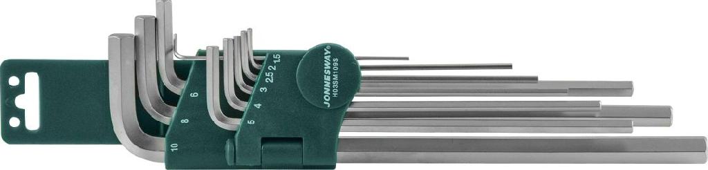 Комплект угловых шестигранников серхдлинных "H02SM109SL" изготовлен из стали S2 в соответствии с требованиями ГОСТ 11737-93, имеет матовое хромоникелевое покрытие. -