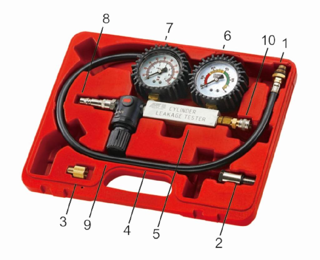 С помощью данного набора можно определять механическое состояние двигателей внутреннего сгорания, в особенности, герметичность камеры сгорания. Набор позволяет обнаруживать дефекты клапанов, поршневых колец, стенок цилиндра (гильзы) и прокладок. В основе метода тестирования лежит определение величины падения давления сжатого воздуха, которое подается в цилиндр через свечное отверстие.