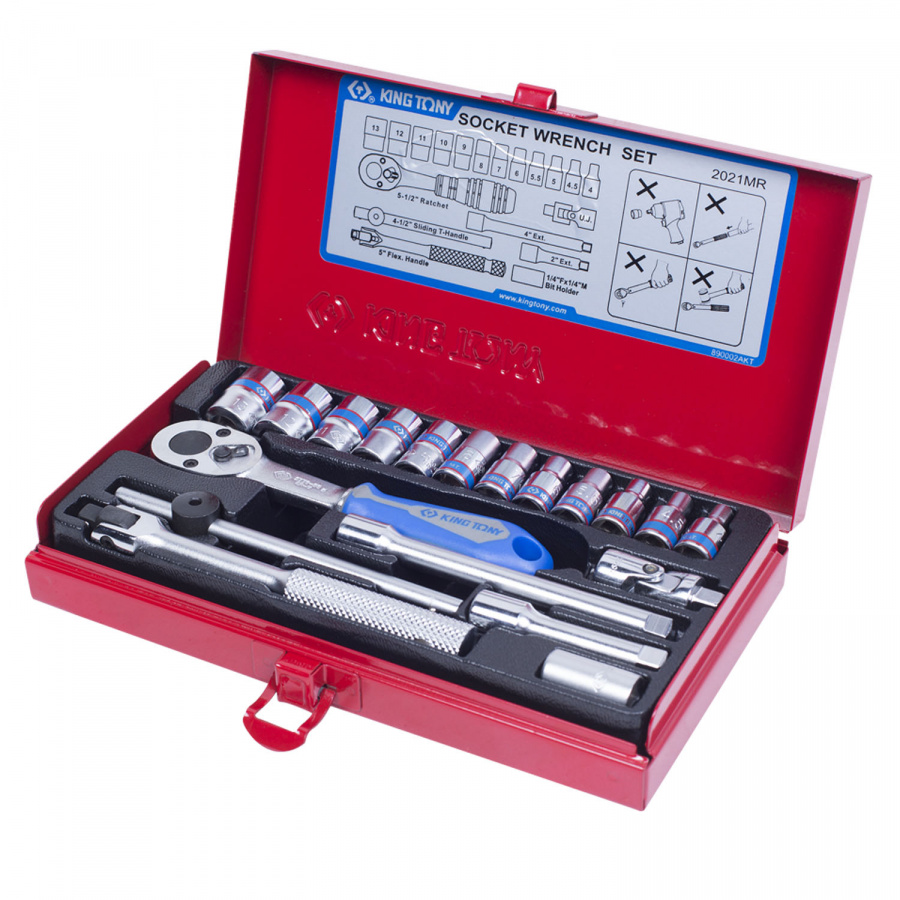 - Набор KING TONY торцевых головок с принадлежностями 1/4", двенадцатигранные, 41365 мм, 19 предметов