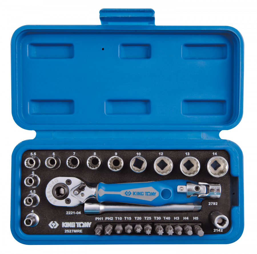 - Набор торцевых головок с принадлежностями 1/4", двенадцатигранные, 4-14 мм, 27 предметов KING TONY 2