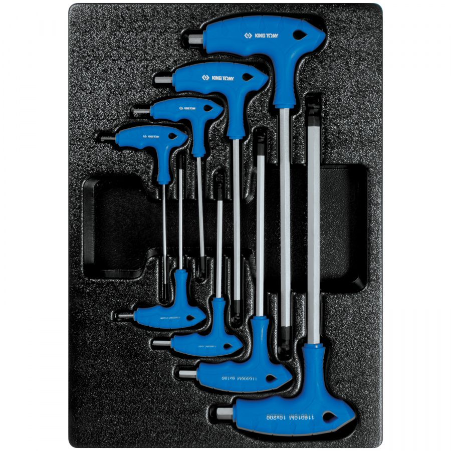 Изготовлены в L-образной форме. Эргономичная форма рукояток, изготовленных из пластика, удобна при удержании инструмента в процессе работы. В процессе производства рабочие поверхности шестигранников KING TONY подвергаются специальной термической обработке, что придаёт им особую прочность и стойкость к износу или сколам. Материал ложемента – ПВХ (поливинилхлорид). Изготовлен специально для комплектации инструментальной тележки.