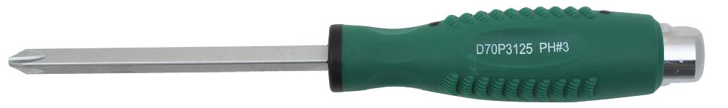 Стержневая отвертка серии "D70" со сквозной установкой стержня из хромомолибденованадиевой стали, намагниченным наконечником и затыльником рукоятки, выдерживающим воздействие удара, ограниченно превращающего отвертку в подобие кернера или выколотки. На затыльнике сформированы грани для применения рожкового ключа, увеличивающего крутящий момент при воздействии на резьбовой крепежный элемент. Современные материалы основы рукоятки обеспечивают снижение вибраций и реактивных моментов при ударной нагрузке, а сантопреновый, устойчивый к скольжению, верхний контактный слой - надежное удержание инструмента в руке. -