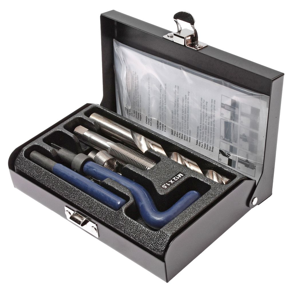 В комплект входят: сверло, метчик, установочный инструмент, инструмент для обламывания хвостовика, резьбовые вставки