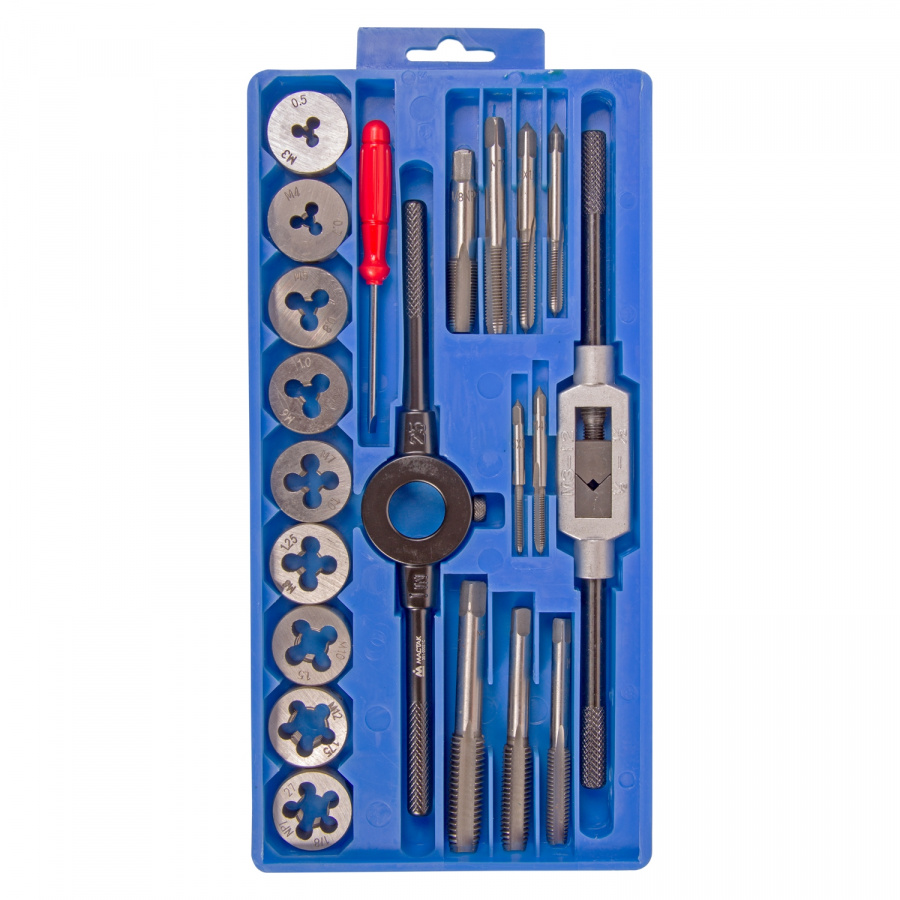 • Метчики и плашки - 18 шт: M3?0.5, M4?0.7, M5?0.8, M6?1.0, M7?1.0, M8?1.25, M10?1.5, M12?1.75, 1/8NPT27.