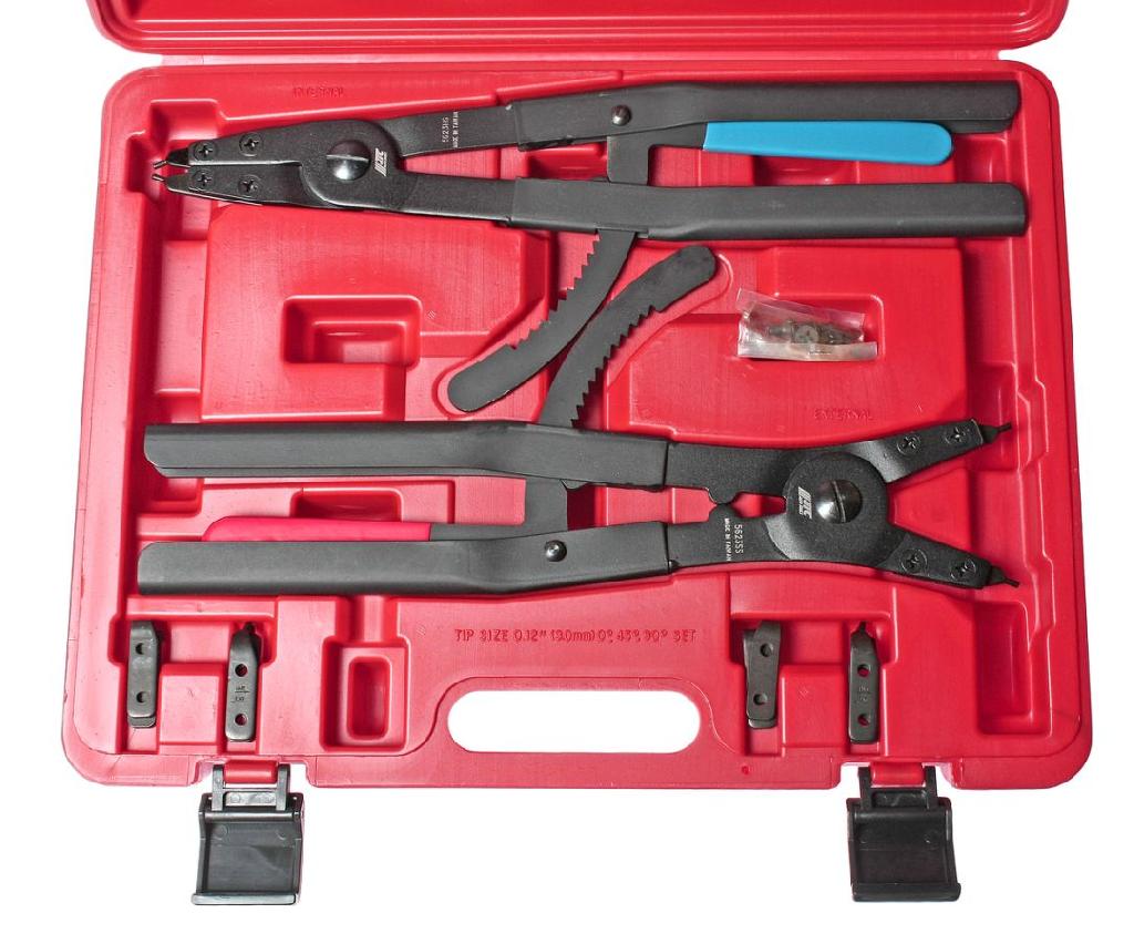 В набор входят сменные наконечники. Клещи с механизмом фиксации позволяют удерживать стопорные кольца, предохраняя их от повреждения.