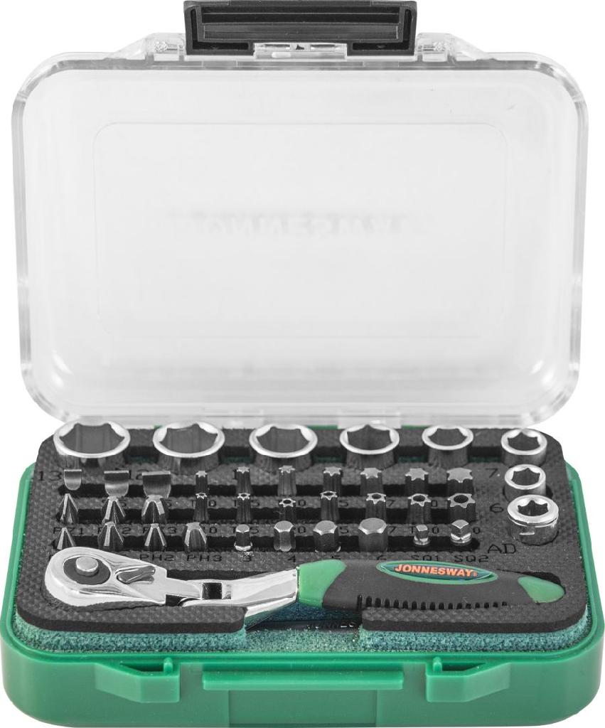 Набор Jonnesway рукоятка трещоточная миниатюрная 1/4"DR со вставками-битами, 40 предметов