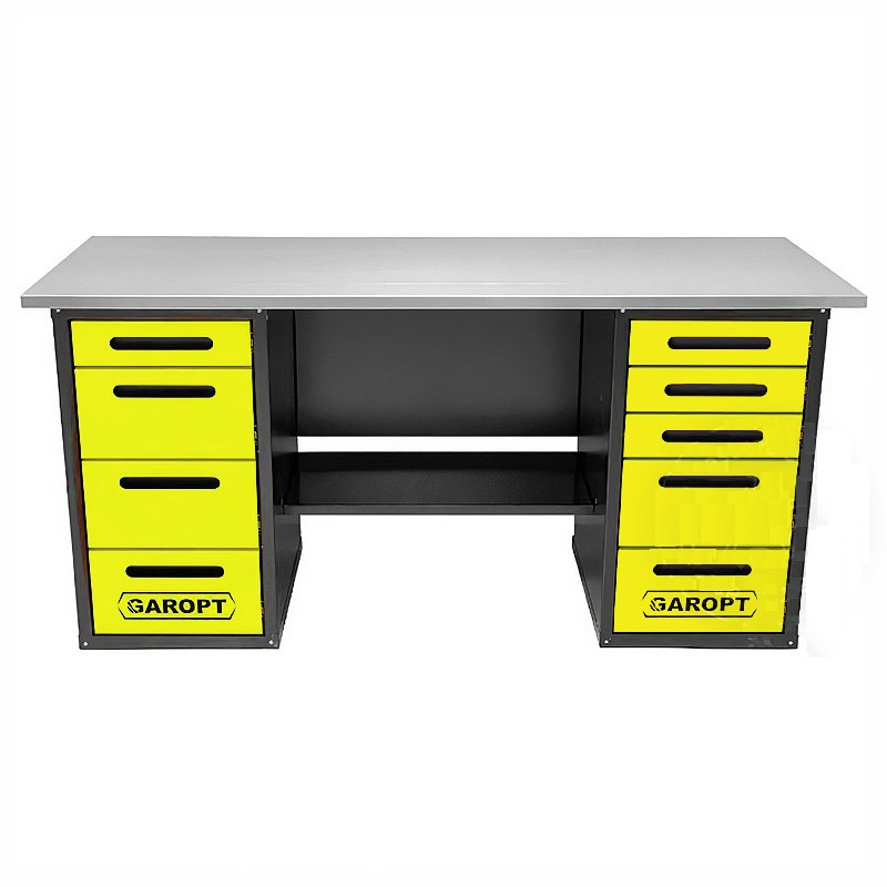 • Верстак GAROPT двухтумбовый,   в одной — четыре ящика,  в другой — пять, для слесарных работ