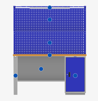 Верстак окрашен порошковой краской, цвет покрытия корпуса серый шагрень (RAL 7038), лицевая панель дверцы тумбы – синий шагрень (RAL 5002)