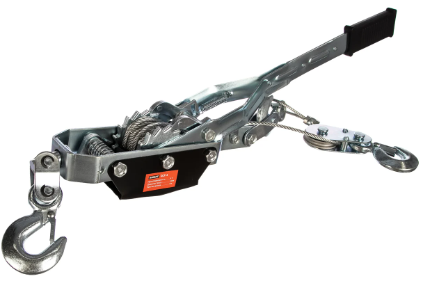 За счет рычага трос наматывается и фиксируется на барабане. Особенность этой лебедки заключается в отсутствии необходимости крепления к поверхности передвигаемого объекта, поэтому возможности ее использования расширяются. Ее можно применять для вытягивания автомобилей и передвижения грузов в быту и строительстве.