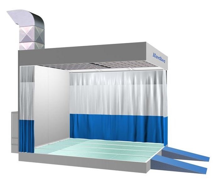 Зоны подготовки автомобилей имеют вытяжной блок с фильтрами очистки воздуха, пленум с осветителями и ПВХ шторы по периметру зоны.