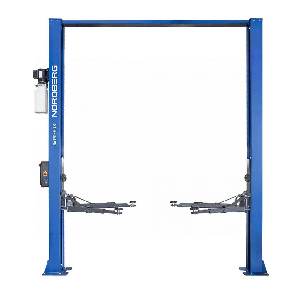 ОписаниеN4120HE-4B_3+2_380 Nordberg Подъемник двухстоечный 4 т, верхняя синхронизация, с электростопорами, H=3,6 м, 380 В, синий
