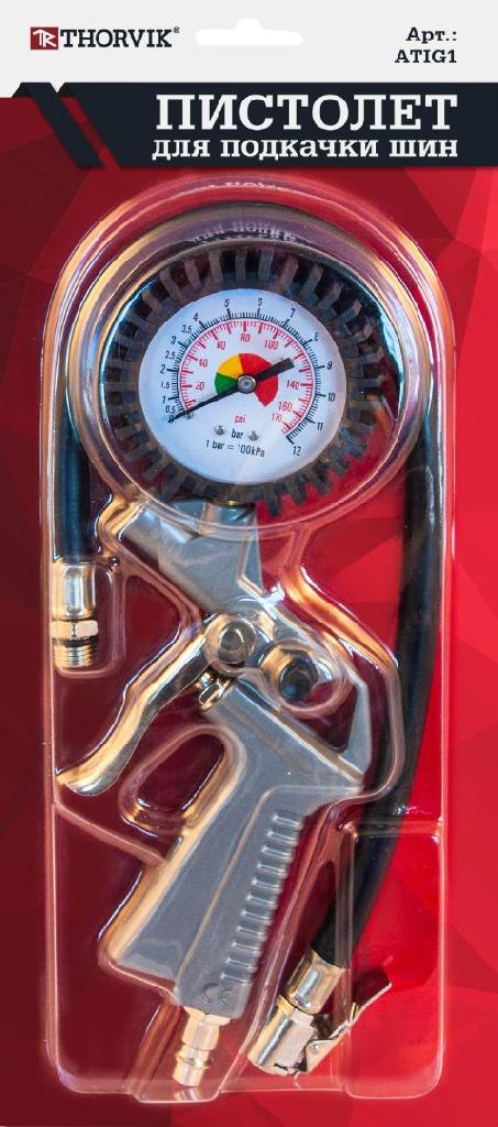 ОписаниеПистолет для подкачки шин TНORVIK® применяется для контроля давления, сброса и подкачки при обслуживании пневматических шин колесных транспортных средств,строительной и сельскохозяйственной техники в диапазоне рабочего давления от 0 до 12 bar (12,24 кгс/см²), персоналом, имеющим соответствующую квалификацию, знакомымс правилами техники безопасности, условиями эксплуатации и навыками работы с инструментом подобного типа. Изделие укомплектовано аналоговым стрелочным манометром класса 2.5 ГОСТ 2405-88, снабженного механизмом деформационного типа. Двушкальная градуировка позволяет контролировать значение в величинах PSI (внутренняя шкала красного цвета) или BAR (внешняя шкала). Манометр снабжен резинополимерным протектором, предотвращающим повреждение прибора при неосторожном обращении.